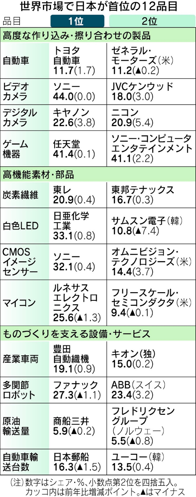 日本勢 得意分野で明暗 世界シェア調査 日本経済新聞
