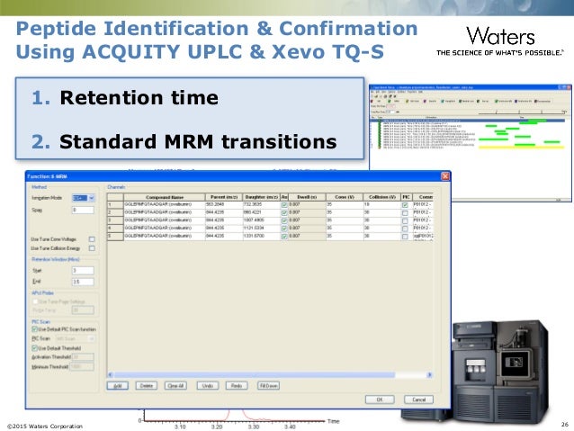 With market-specific software platforms to empower rapid data processing, interpretation, reporting and management, find out how our software enables you to easily access and share the valuable insights from your high-quality data sets. Waters MassLynx 4.0 This LCT premier is operated in flow injection analysis mode for the rapid analysis of single compounds or very limited mixtures ESI LC-TOF Micromass LCT 4. LC-MS/MS analysis was performed using a Waters™ Xevo™ TQ-XS Tandem Quadrupole mass spectrometer coupled to an ACQUITY™ UPLC™ I-Class PLUS System.